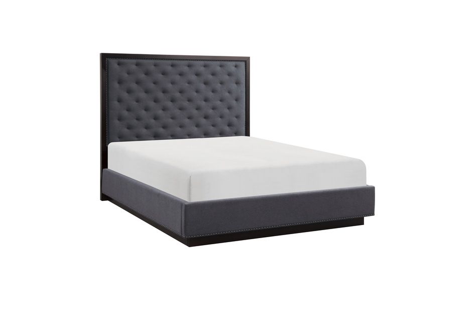 The striking profile of the Larchmont Collection is an intersection of texture, material and style. The charcoal upholstered bed features pin-tucked button tufting and nail head accent.